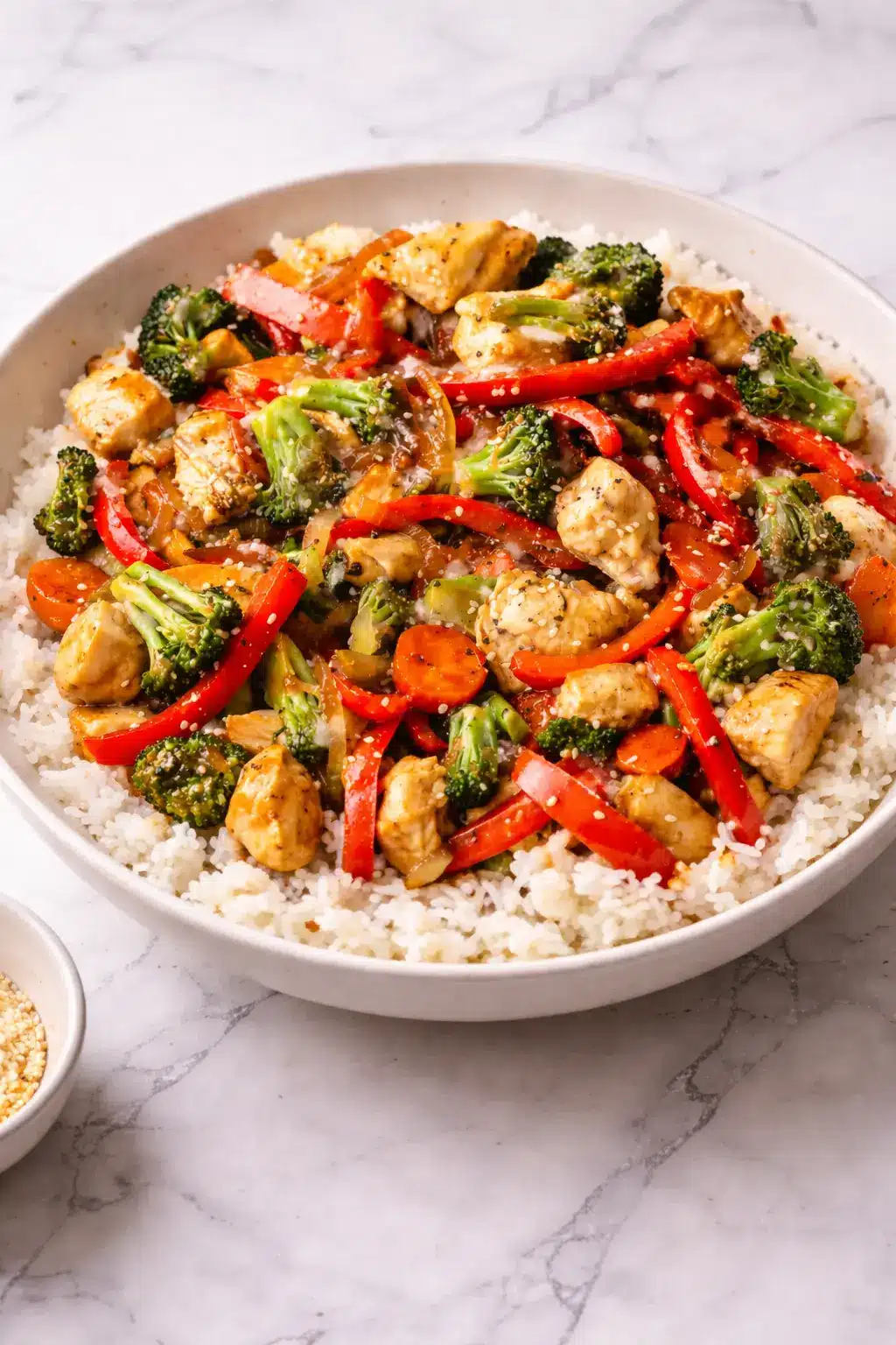 Chicken Stir-Fry served over rice with broccoli, bell peppers, and carrots as a complete meal
