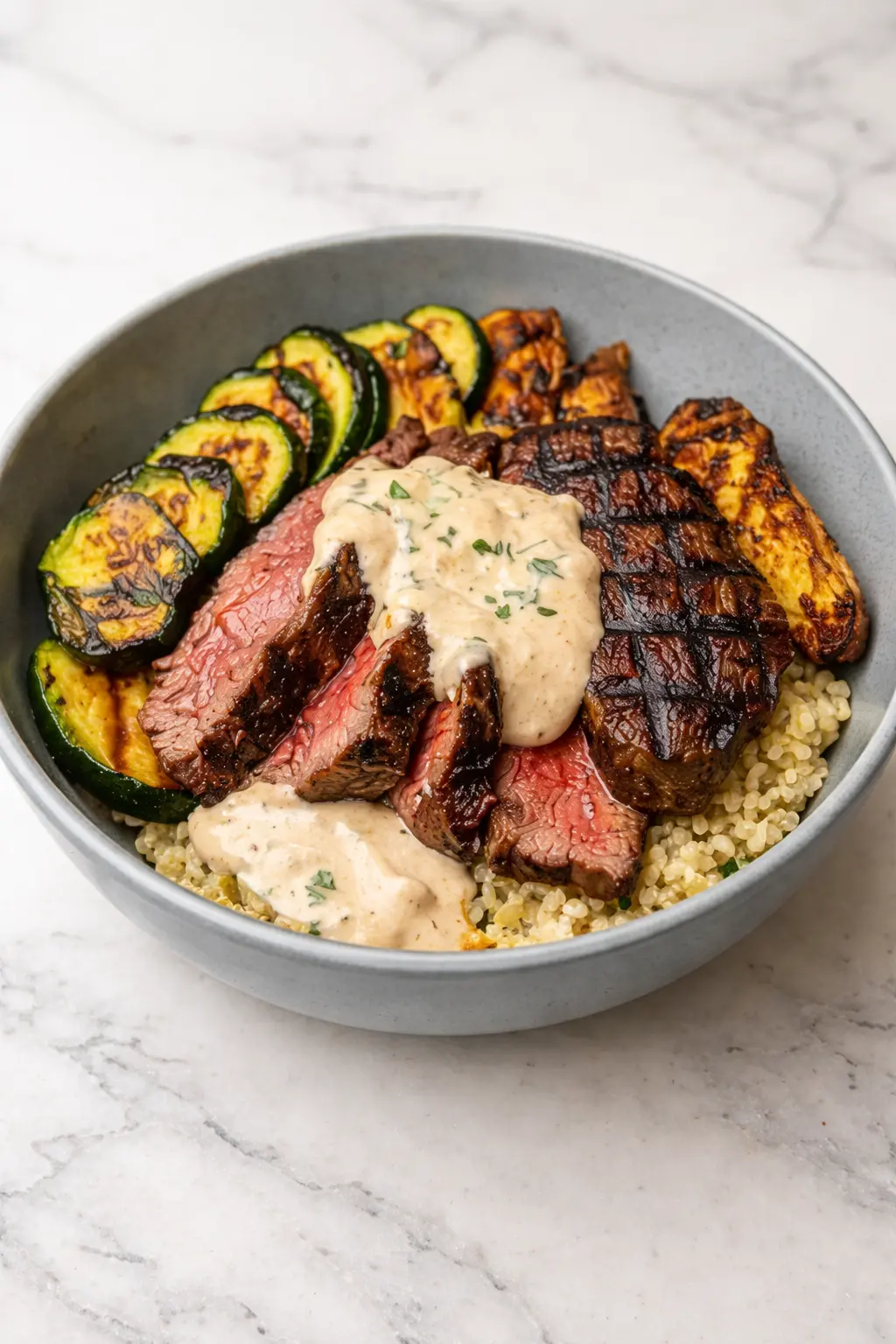 Grilled Steak Bowl with Creamy Sauce & Grilled Zucchini
